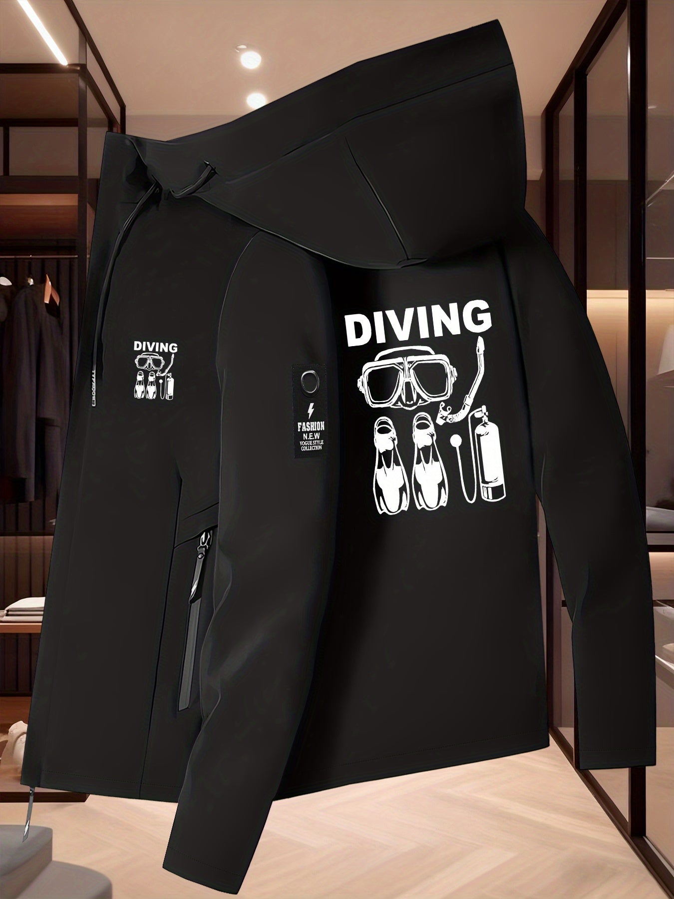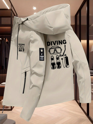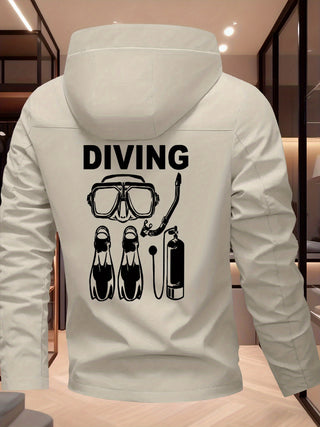 Featuring a bold “DIVING” print and red logo, this modern zip-up jacket adds a sporty edge to any outfit. The front pockets provide convenient storage, while the hooded collar and zipper closure make it perfect for casual outings, workouts, or travel.